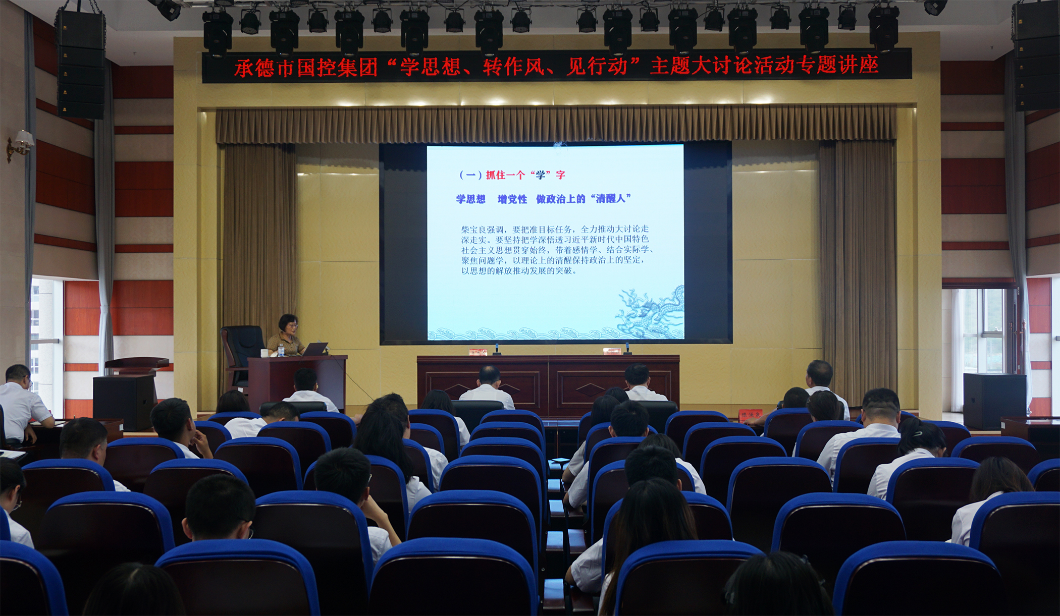 2023年7月6日,為深入學(xué)習(xí)貫徹習(xí)近平總書記關(guān)于堅(jiān)持不懈抓好作風(fēng)建設(shè)的重要論述,落實(shí)市委市政府關(guān)于在全市開(kāi)展“學(xué)思想、轉(zhuǎn)作風(fēng)、見(jiàn)行動(dòng)”主題大討論活動(dòng)精神,市國(guó)控集團(tuán)邀請(qǐng)承德市委黨校黨史黨建教研室主任王仲娟教授,開(kāi)展了“學(xué)思想、轉(zhuǎn)作風(fēng)、見(jiàn)行動(dòng)”主題大討論活動(dòng)專題講座,市國(guó)控集團(tuán)領(lǐng)導(dǎo)班子、集團(tuán)本部全體員工、實(shí)際控制子公司中層以上負(fù)責(zé)同志及黨員員工參加講座。