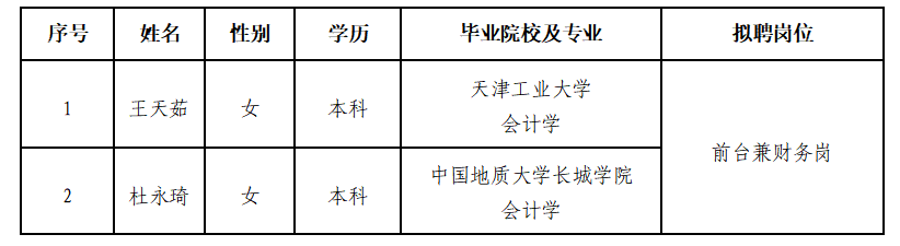 因公司發(fā)展需要,承德市建設(shè)投資有限責(zé)任公司委托第三方機(jī)構(gòu)面向社會(huì)公開(kāi)招聘前臺(tái)兼財(cái)務(wù)崗員工。現(xiàn)對(duì)擬錄用人員信息進(jìn)行公示,公示期間如有異議,可通過(guò)電話、信函等方式反映,反映意見(jiàn)請(qǐng)署真實(shí)姓名。